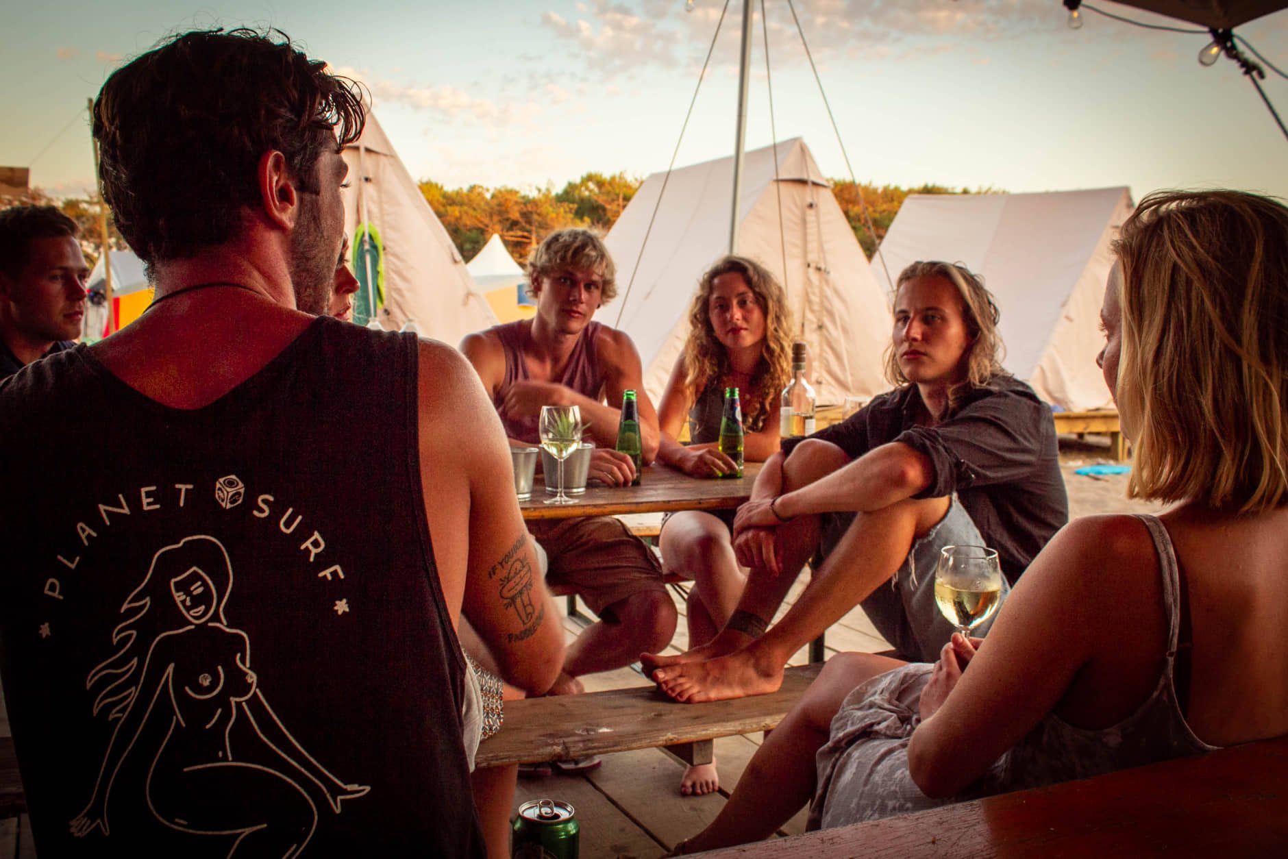 All-inclusive glamping surf camp near Bordeaux with 12-22 surf lessons, yoga, full board meals, and social activities. Ages 18+ with average guests between 18-35 years old.