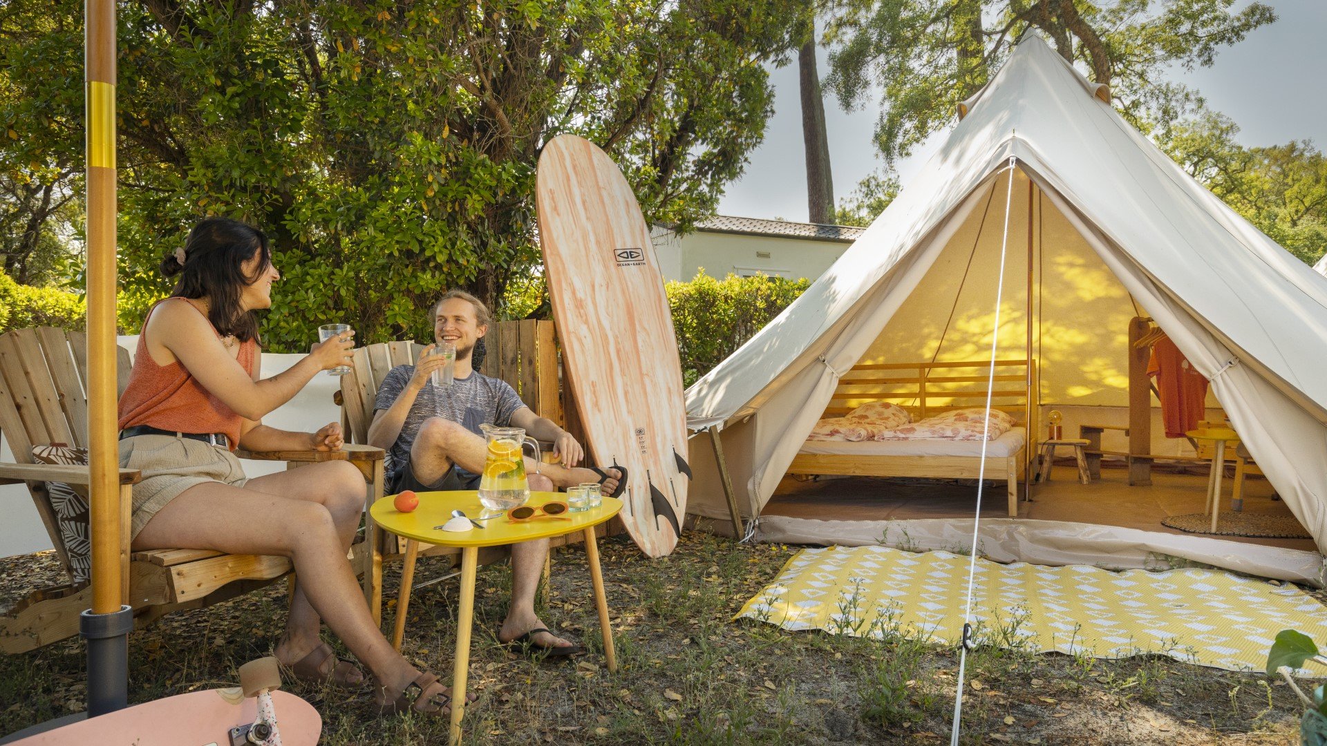 Vegan Surf Camp runs a community-based surf and yoga experience on the Atlantic coast of Les Landes, France. Founded by the non-profit Association L'Amour de la Terre in 1995, the camp combines surf lessons, daily yoga sessions, and organic plant-based meals. The main location at Camping Albret Plage in Messanges offers car-free direct beach access, just steps from the dune and walking distance to local shops and restaurants.