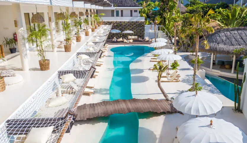 Kima Surf Camp Canggu is a premium surf, yoga, and fitness resort located 250 meters from the beach in Bali's vibrant Canggu district. With twice-daily surf guiding, a 400m² gym with 15-meter climbing wall, and multiple pools including a 50-meter beach pool with diving platform, the camp offers an all-inclusive surf vacation experience for all skill levels.