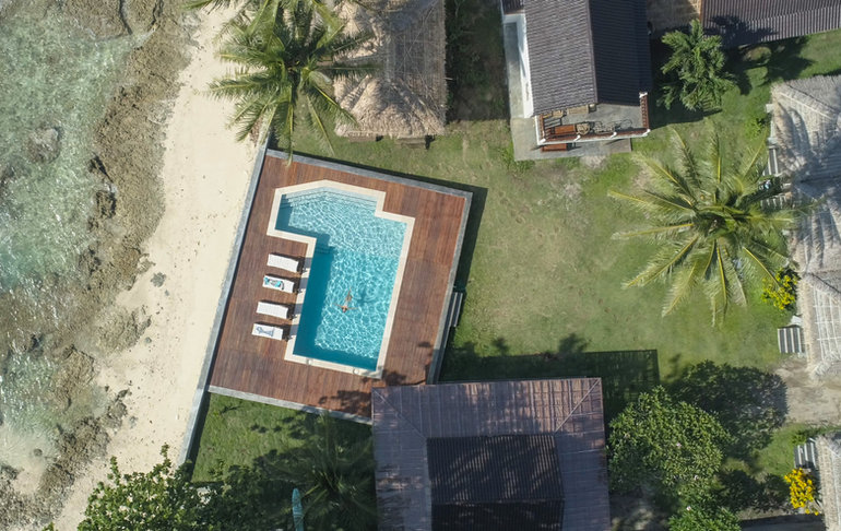 Deluxe suite with 3 single beds or 1 king bed plus 1 single bed. Features A/C, mosquito repellent, closet, and desk. Private spacious bathroom with Western-style shower (no hot water). This ground floor room offers views across the garden, swimming pool, and out to the ocean. Includes its own terrace for enjoying the outdoors.