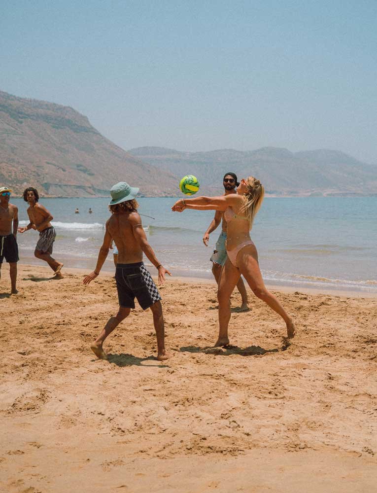 The surf camp operates as a full-service retreat. Guests choose between the Beginner & Intermediate package with daily lessons and theory sessions, or the Guiding package for confident surfers who want local knowledge without instruction. Both include 7 nights accommodation, full board (breakfast, lunch, dinner), airport transfers from Agadir or Essaouira, and surf equipment.