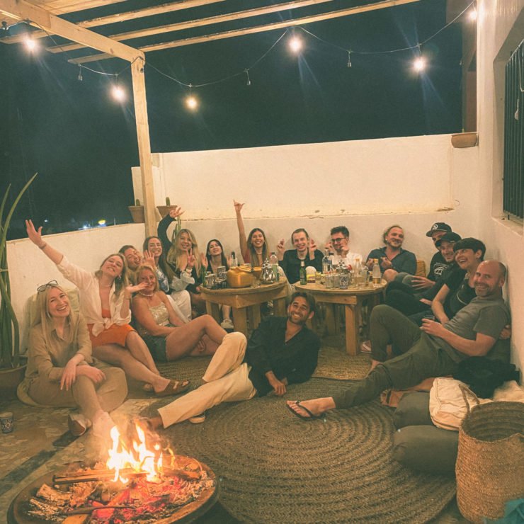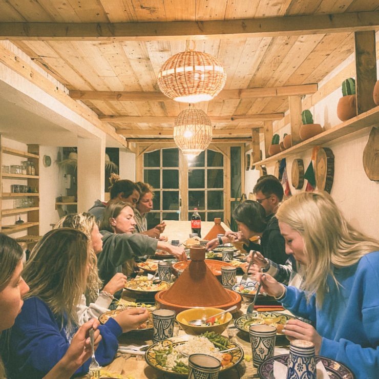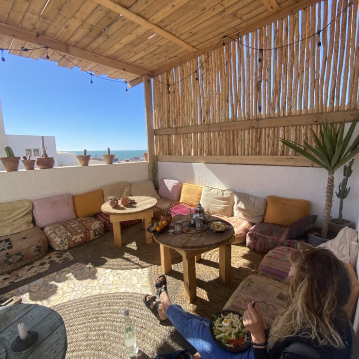 Guests enjoy traditional Moroccan cuisine including tagine, couscous, harira soup, and pastilla, prepared by Chef Karima using local ingredients. The wooden rooftop terraces offer sea views and the perfect space for relaxation, sunset yoga sessions, or unwinding in the hammock area with views of Cathedral Point. Evenings bring everyone together for Moroccan dinners, games, and bonfires.