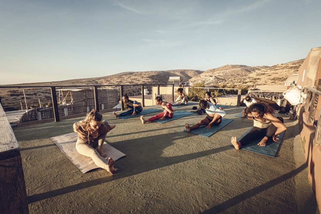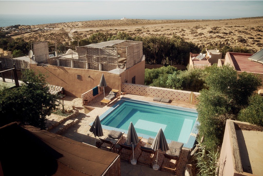 Surf camp overlooking Imsouane village with panoramic sea and mountain views. Features a 30m3 pool, yoga terrace, Berber tent, and skate ramp. All rooms include handcrafted Berber woodwork and breakfast. Weekly surf packages include ISA-certified coaching, video analysis, yoga, and local excursions.