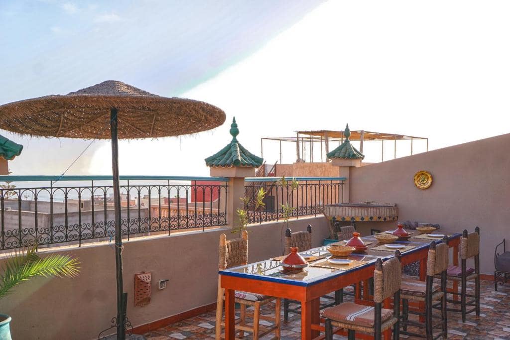 Dar Sultana Surf Camp in Tamraght offers surf and yoga packages for all skill levels in Morocco's famous Taghazout region. Located in a traditional Moroccan building just minutes from the beach, the camp provides professional surf coaching for beginners and intermediates, as well as guided sessions for experienced surfers looking to explore the best local breaks. The all-inclusive packages cover accommodation, three meals daily with vegetarian and vegan options, surf equipment, and airport transfers from Agadir. A rooftop terrace with ocean views serves as the social hub where guests gather for meals and relaxation after surf sessions. The camp operates year-round with certified instructors who know the area's waves intimately.