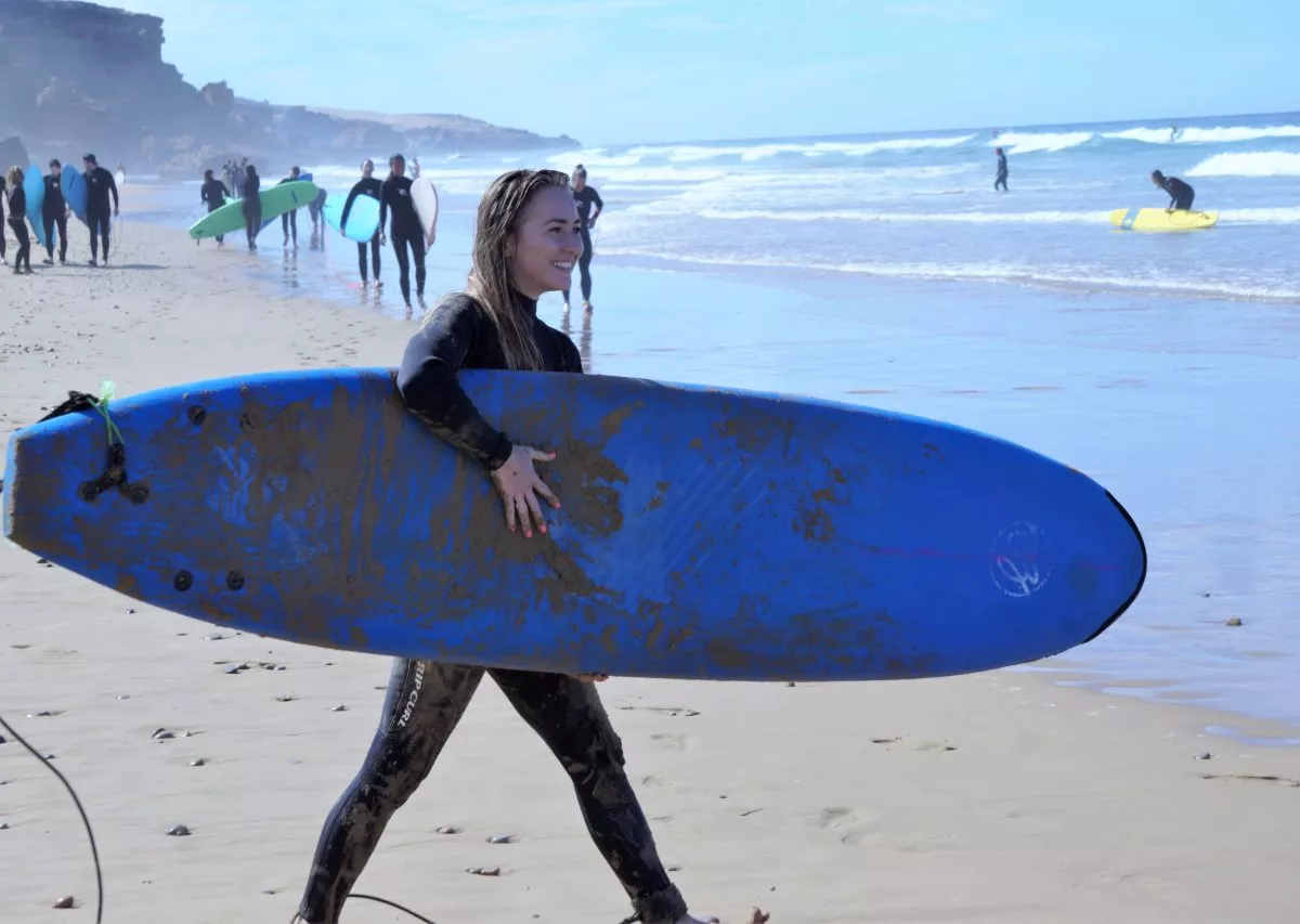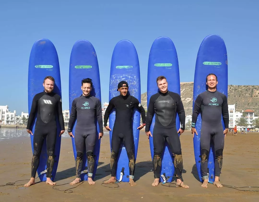 My Surf Hostel is a friendly surf camp in Taghazout Bay, Morocco, operating since 2015. The camp caters to all surf levels with professional instruction, quality equipment, and daily transfers to the best breaks. Beyond surfing, guests enjoy yoga sessions, Paradise Valley excursions, traditional Souk visits, and healthy homemade meals. The hostel contributes 0.5% of revenue to carbon removal initiatives.