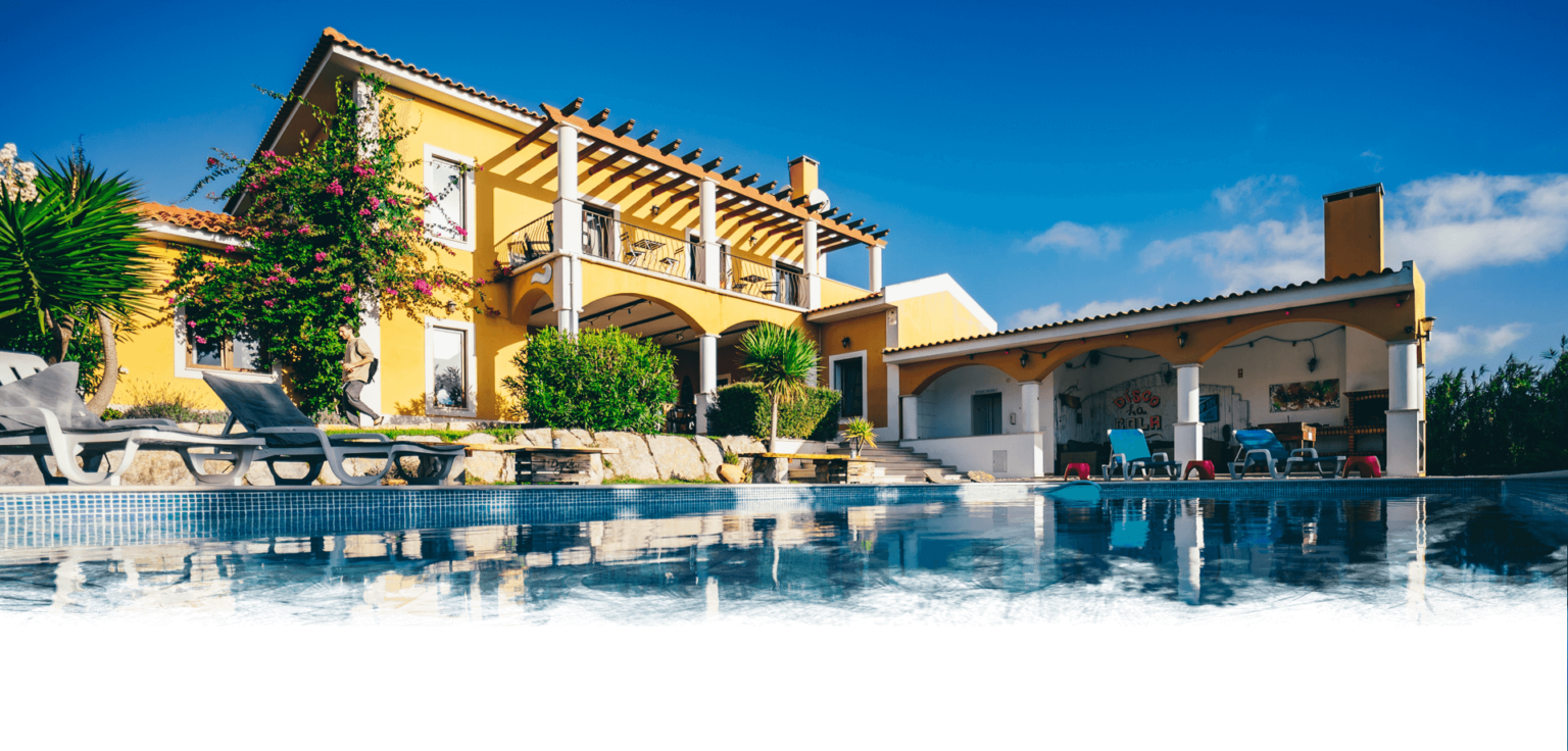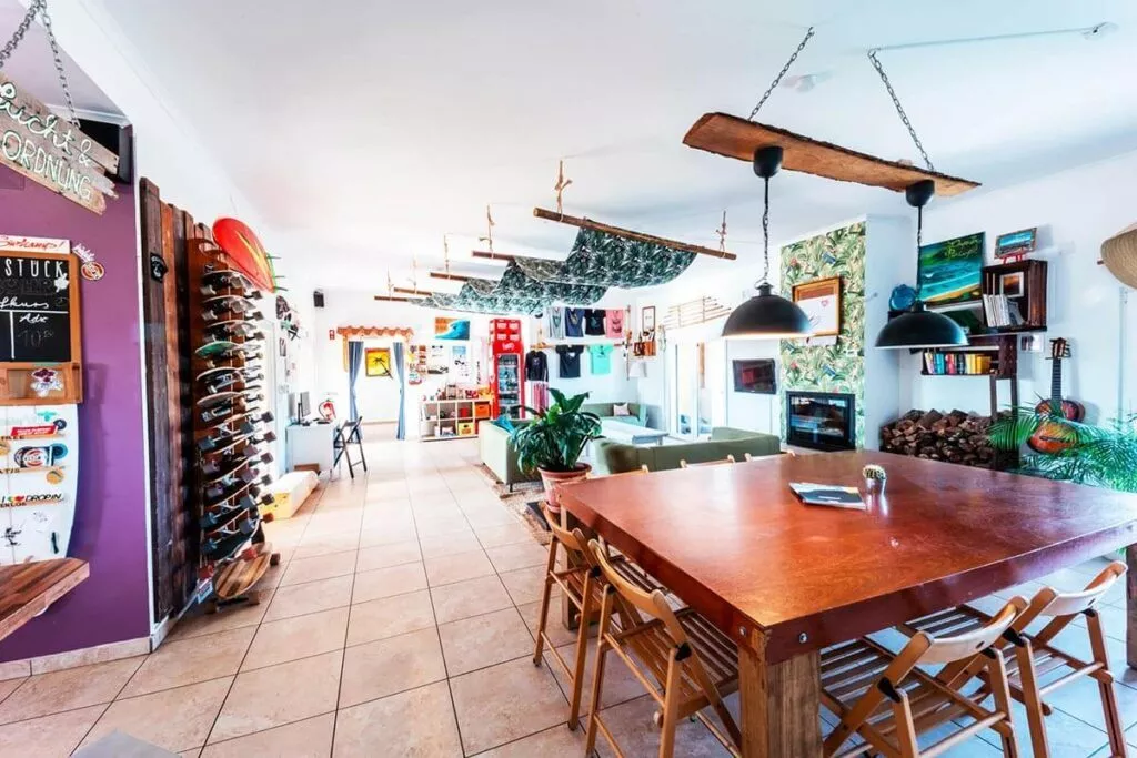 Drop In Beachlodge runs year-round on Portugal's Silver Coast with space for 20 guests and instructors living on-site. The garden features a pool, skatebowl, and volleyball—plus walking distance to the beach and surf station.