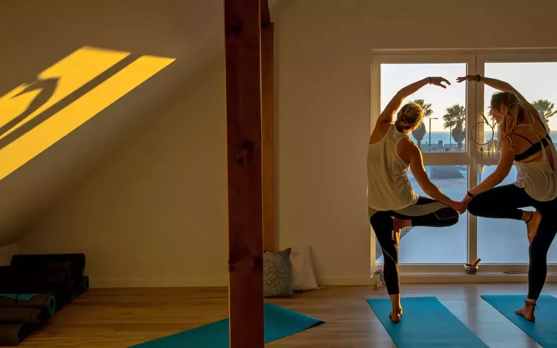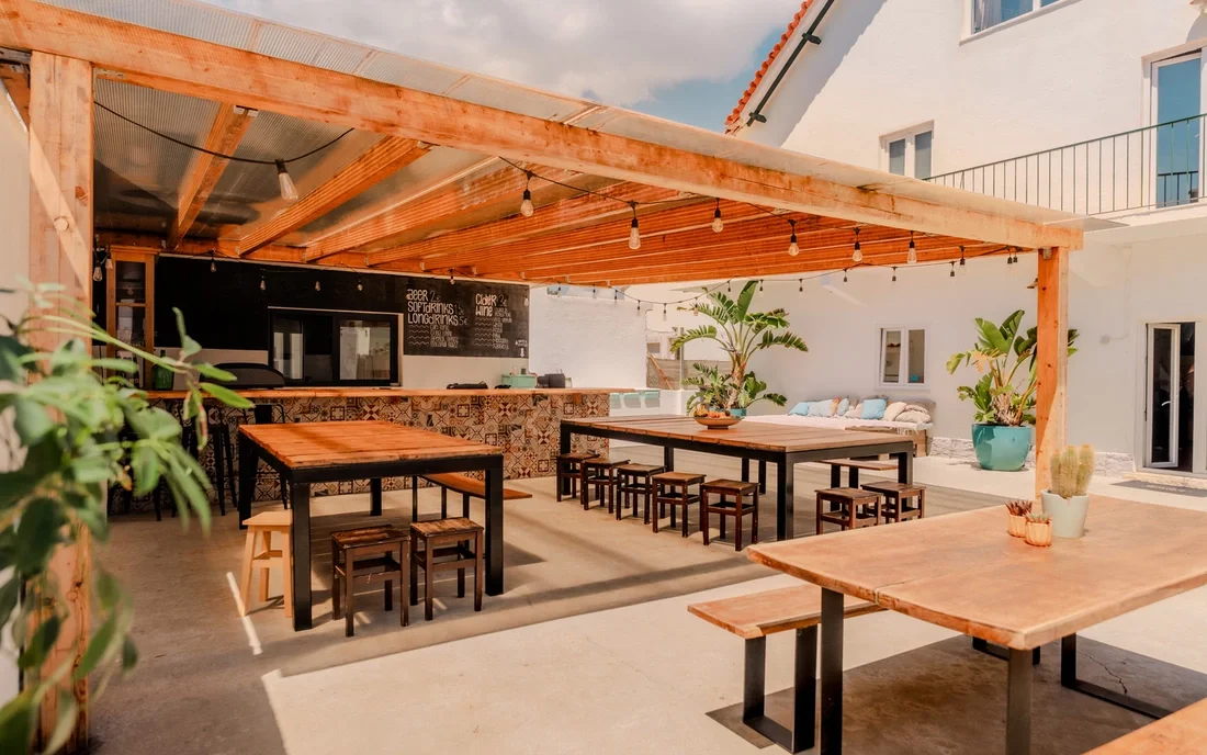 Puresurfcamps Surfhouse Caparica puts you 150m from Costa da Caparica's breaks with Lisbon 20 minutes away. From €359/week including breakfast, 5 dinners, yoga, cross-training, and wine tasting—stylish outdoor bar and sea-view yoga room.