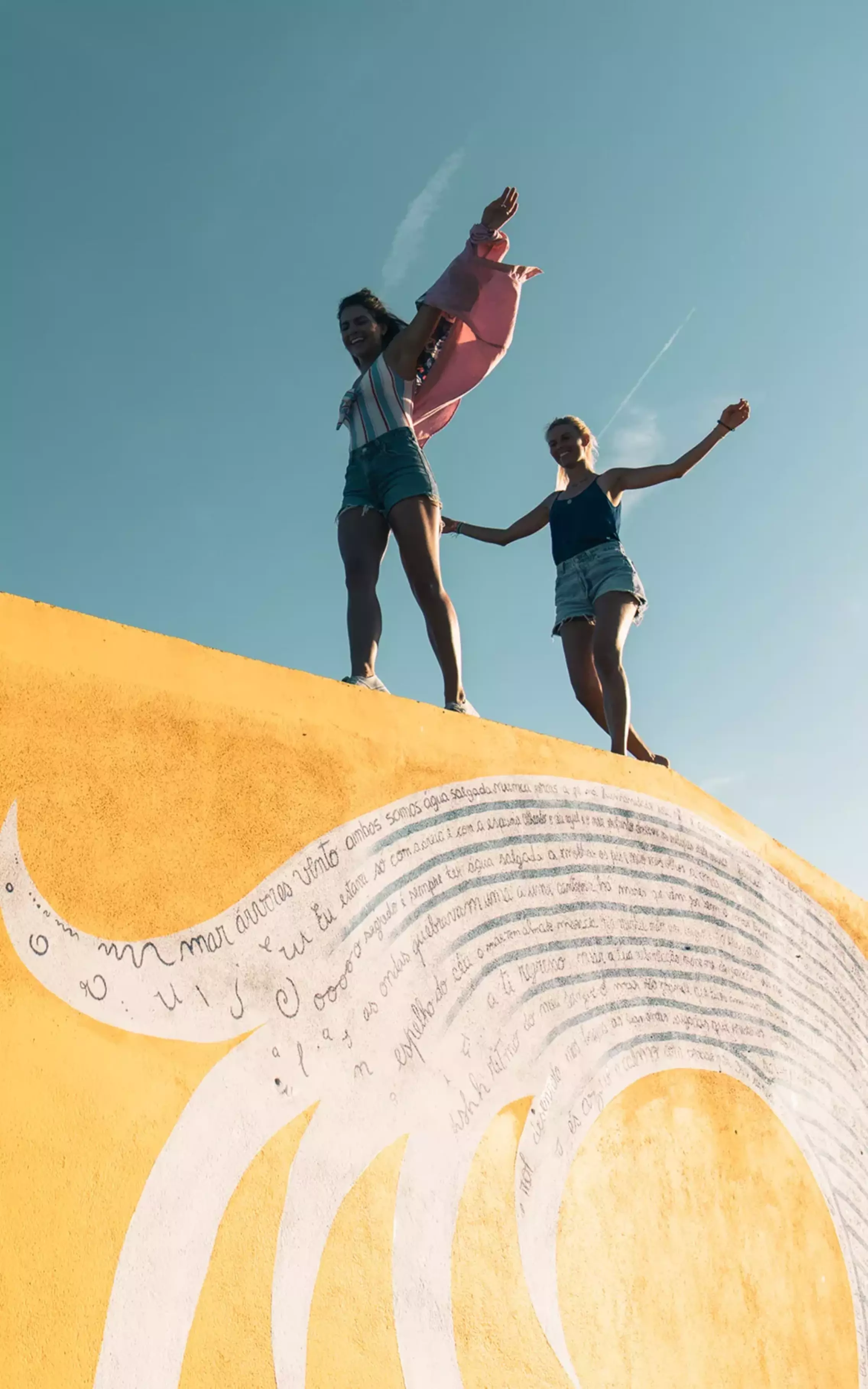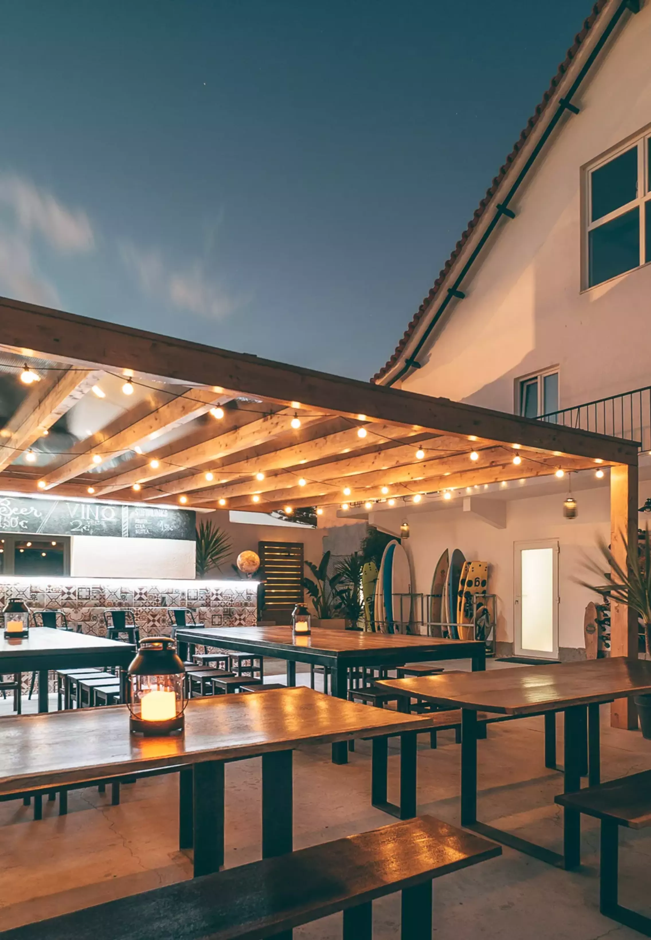 Puresurfcamps Beachfront Surfcamp sits directly on the beach at Fonte da Telha with pool and ocean views. From €339/week including breakfast, 3 dinners, yoga, and cross-training—30 minutes from Lisbon.