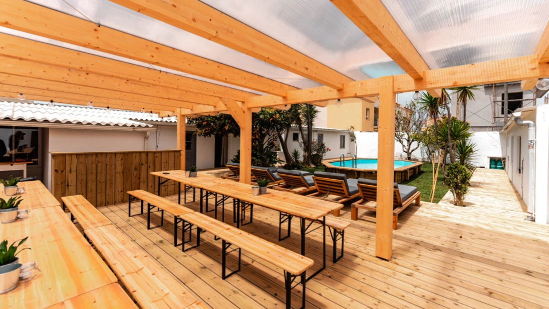 Cozy apartment for couples or friends, located in the garden of Surfcamp Peniche. Features a separate bedroom, kitchen, and bathroom. Five units available for exclusive booking with garden access.